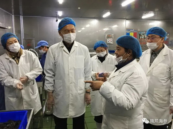 調(diào)研組一行在企業(yè)高管的引領(lǐng)下,實地察看曉芹公司的生產(chǎn)、加工、殺菌和包裝車間等,近距離了解海參的生產(chǎn)工藝和加工流程,并不時相互討論交流。
